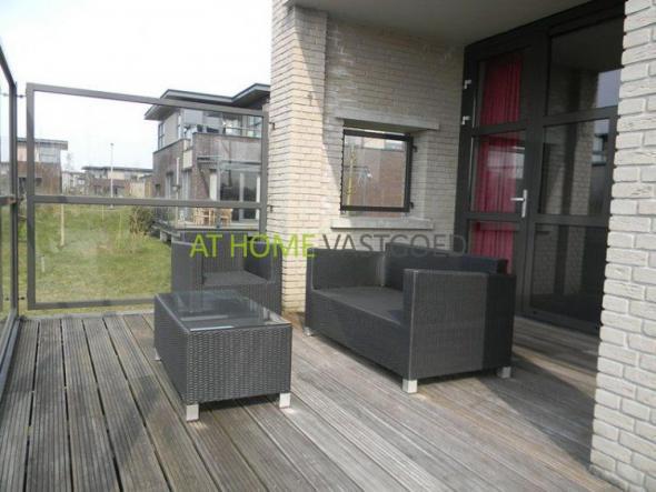 Vanuit de woonkamer via een schuifdeur toegang tot het ruime terras van 50 m². Dit terras is voorzien is van een balustrade en gedeeltelijk van glazen wanden zodat u altijd beschut van het buiten klimaat kunt genieten.