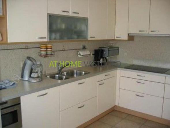 De keuken is uitgevoerd in een hoekopstelling met onder- en bovenkastjes en vaatwasser, combimagnetron, keramische kookplaat, 1 1/2 spoelbak en vlakscherm afzuigkap
