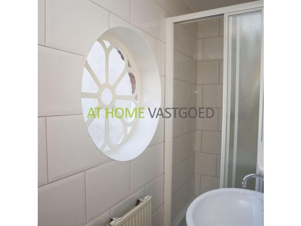 De moderne badkamer met sfeervol raam is voorzien van een ruime douchecabine, wastafel, toilet en wasmachine aansluiting.
