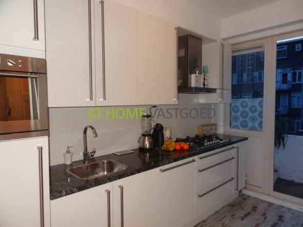 Strakke moderne keuken uitgerust met een vaatwasser, koel- en vrieskast, oven, 5-pits gaskookplaat en afzuigkap. De keuken biedt tevens toegang tot het balkon aan de achterzijde.