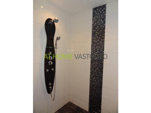Nette en fris betegelde badkamer met heerlijke inloopdouche en moderne wastafel. Separaat toilet, deze is net als de badkamer recent betegeld.