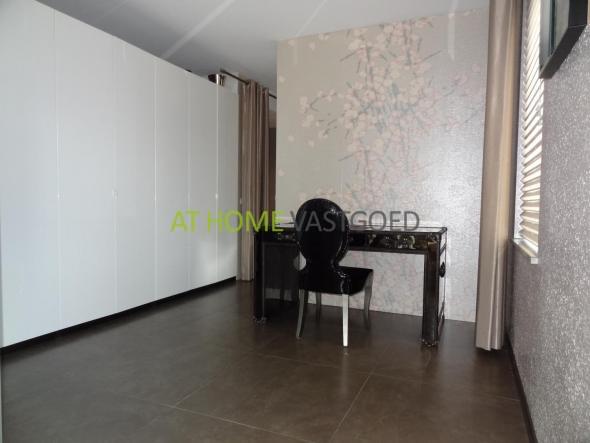 Middels een ingenieus schuifdeuren systeem bereikt u de studykamer/inloopkast met luxe bureau. De slaapkamer is voorzien van tweepersoonsbed en TV.