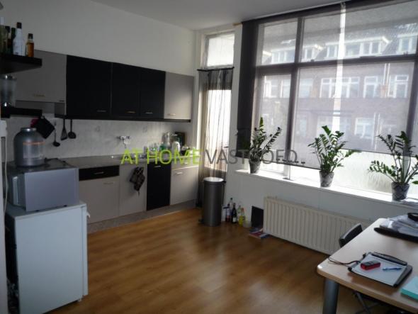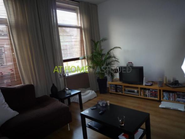 entree appartement, eetkamer (ca. 2.6m x 5.3m) met daaraan grenzend de ruime en lichte keuken (ca. 4.4m x 3.2m). De nette keuken is voorzien van een oven, 4-pits gas kookplaat, afzuigkap, dubbele spoelbak en heeft een mooie laminaat vloer. Via de keuken heeft u toegang tot het balkon. De nette woonkamer (ca. 4.5 x 3.6) is tevens voorzien van een laminaat vloer en heeft door de grote raampartijen veel lichtinval. Zowel de badkamer als het aparte toilet bevinden zich op de eerste verdieping.