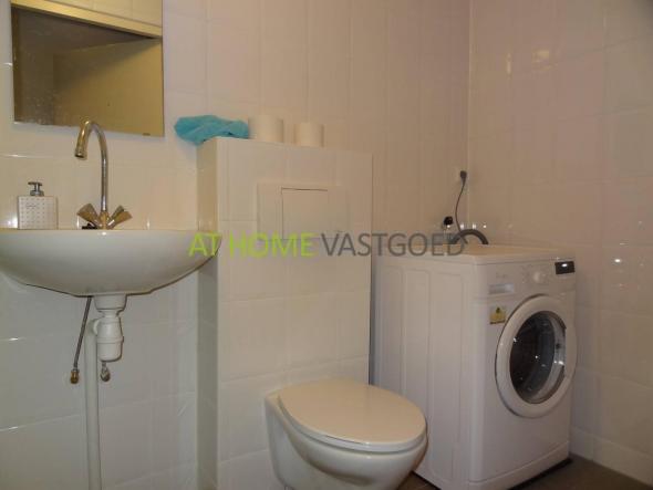Badkamer met wasmachine en douchecabine