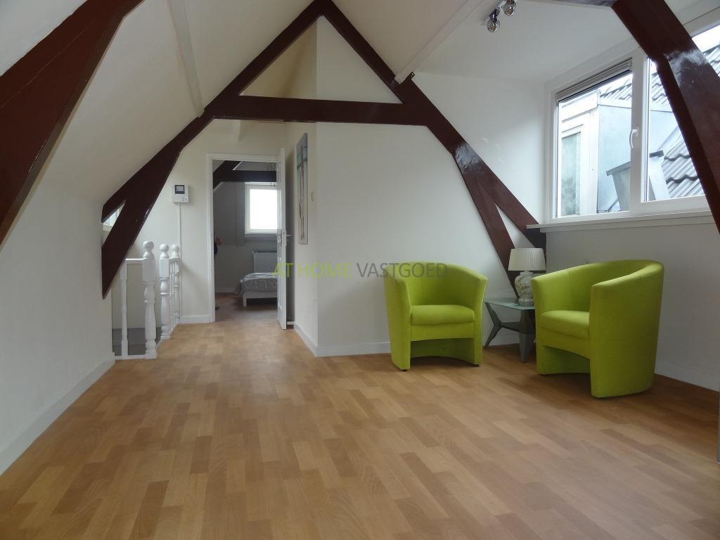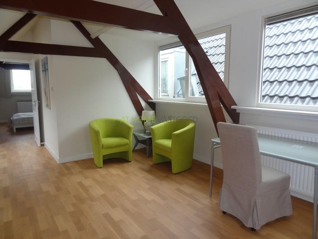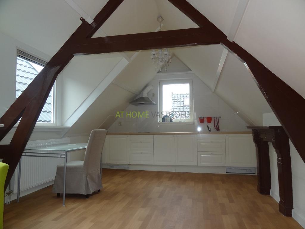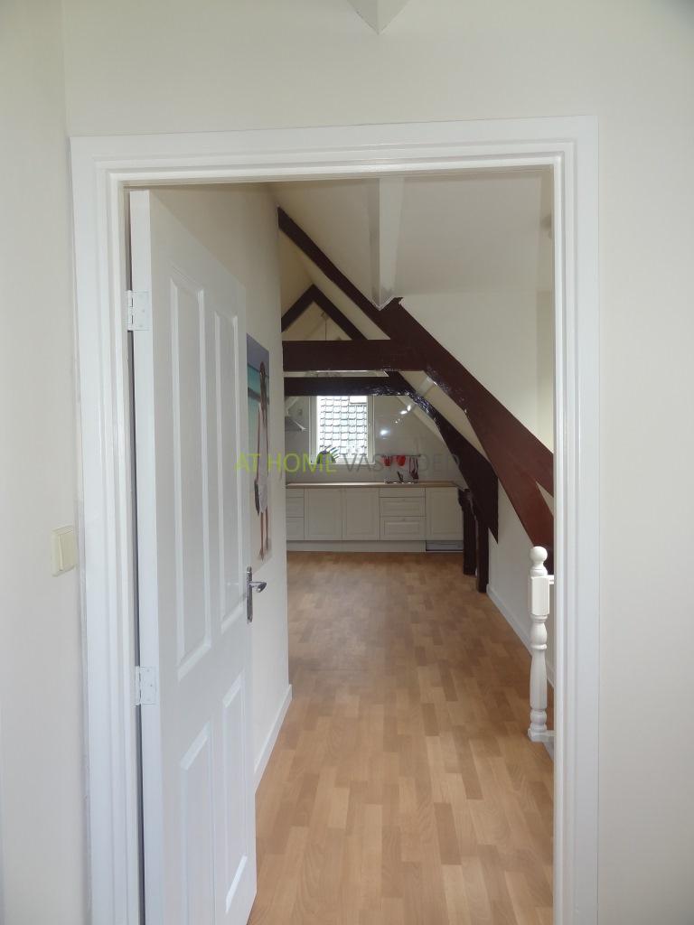 Trap naar de 3e etage. Entree appartement. Badkamer voorzien van douche/ stoomcabine, toilet en wastafel. De ruime woonkamer is voorzien van mooie karakteristieke houten balken en een open keuken met kookplaat, afzuigkap, wasmachine en koelkast.