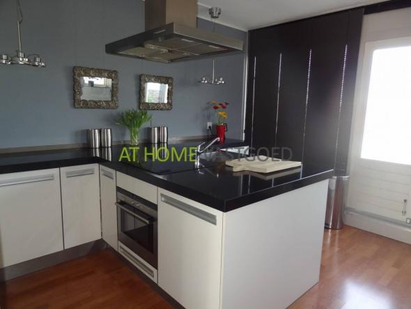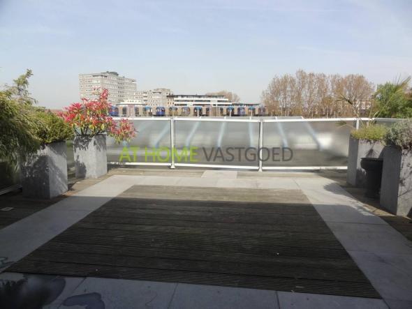 5e verdieping: Lichte woonkamer met laminaatvloer, 2x openslaande deuren naar de stijlvol aangelegde dakterrassen met fantastisch uitzicht per terras. Het terras grenzend aan de keukenkant ligt op het zuid-oosten en het terras grenzend aan de woonkamerkant ligt op het zuid-westen. Luxe open keuken, met vaatwasser, koelkast, vriezer, combi-oven, 4-pits inductie-kookplaat en RVS afzuigschouw.