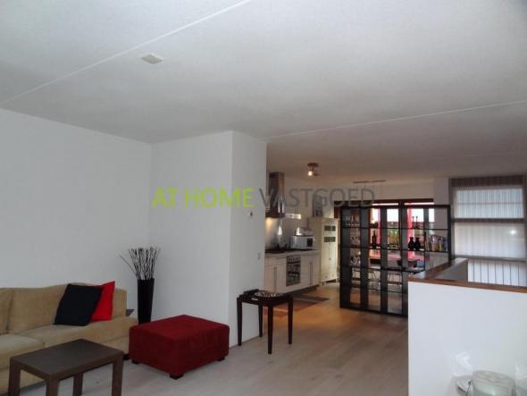 Ruime woonkamer (ca 48 m2 ) met aan de voorzijde eettafel en keuken. Aan de achterzijnde, grenzend aan het teras, is het zitgedeelte gesitueerd. Een schuifdeur geeft toegang tot het terras. Via het terras is tevens de parkeerplaats te bereiken.