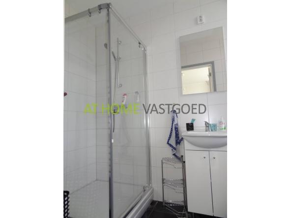 Luxe badkamer met douchecabine, wastafel meubel, radiator en wasmachine aansluiting. De slaapkamer is gelegen aan de achterzijde.