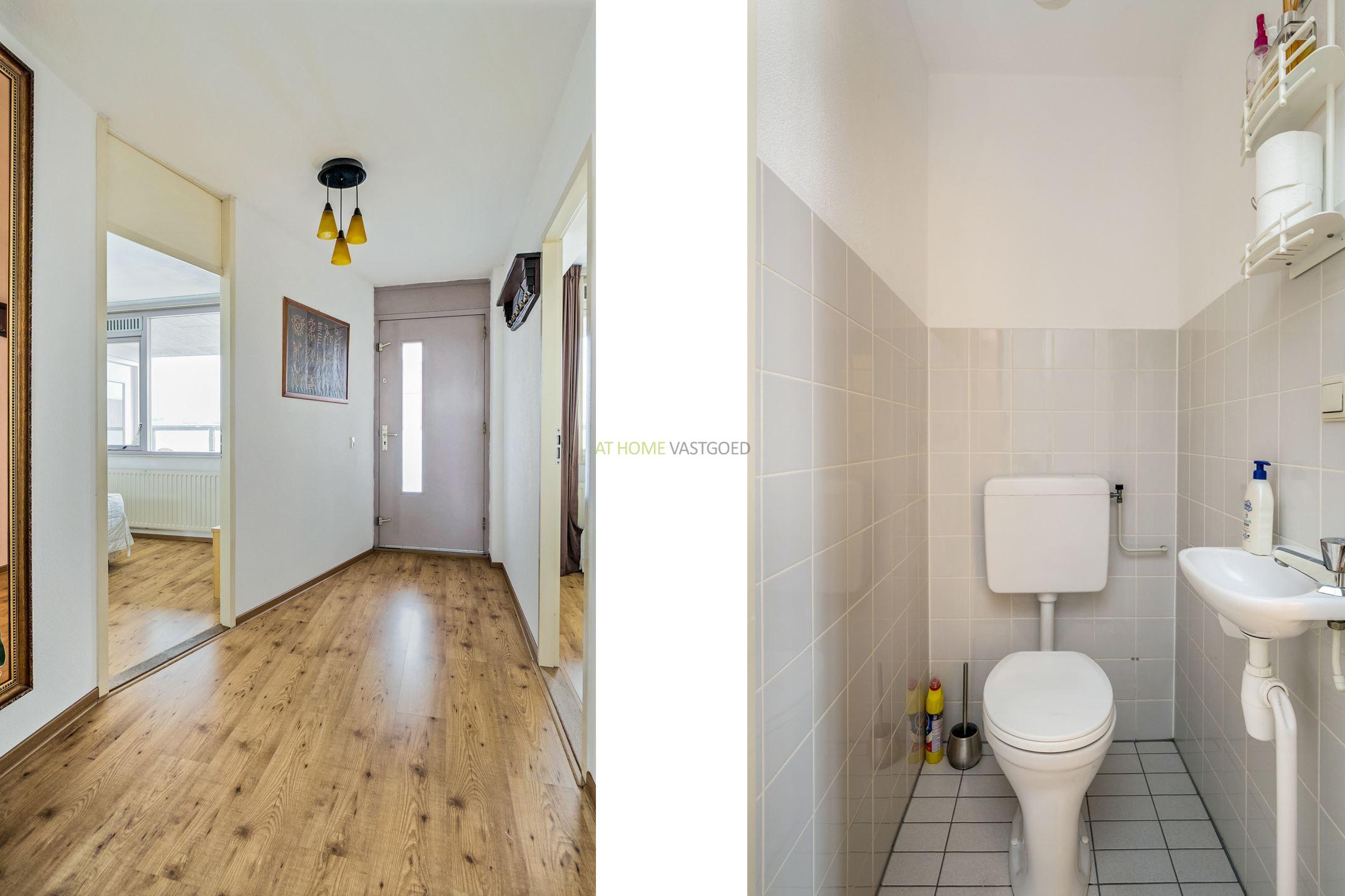 Galerij, entree, hal met toegang tot alle vertrekken, ruime woonkamer met een keurige half-open keuken welke is voorzien van gaskookplaat, combi-oven, koel/vrieskast, vaatwasser en afzuigkap. 2 ruime slaapkamers welke beide aan de achterzijde van het aparement zijn gelegen. Keurige badkamer voorzien van bad met douche en wasbak met meubel. Het toilet is in de hal en is apart van de badkamer.