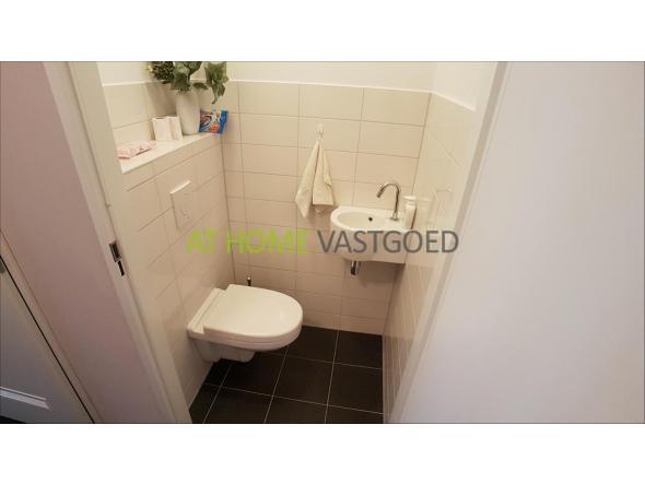 Het toilet op de gang is voorzien van een luxe afwerking. Een wandcloset, wastafeltje en voorzien van wand- en vloertegel.
