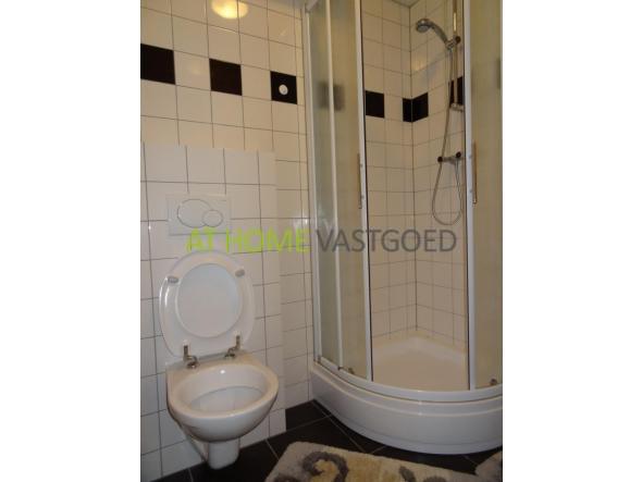 Badkamer voorzien van een douchecabine, toilet en is volledig betegeld
