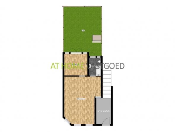 Begane grond: entree, ruime woonkamer (ca.40m2) met grote raampartijen waardoor deze veel lichtinval geniet. Nette open keuken voorzien van keramische kookplaat, afzuigkap en koelkast met vriesvak. De ruime slaapkamer van ca. 15m2 is gelegen aan de achterzijde en geeft middels openslaande deuren toegang tot de tuin. Volledig en fris betegelde badkamer met bad/douche combinatie, wastafel, toilet en een wasmachine aansluiting.