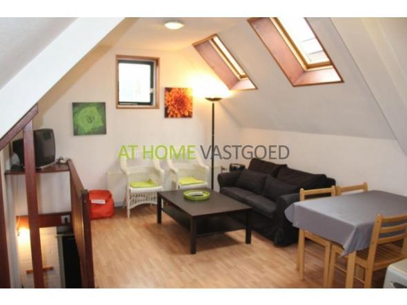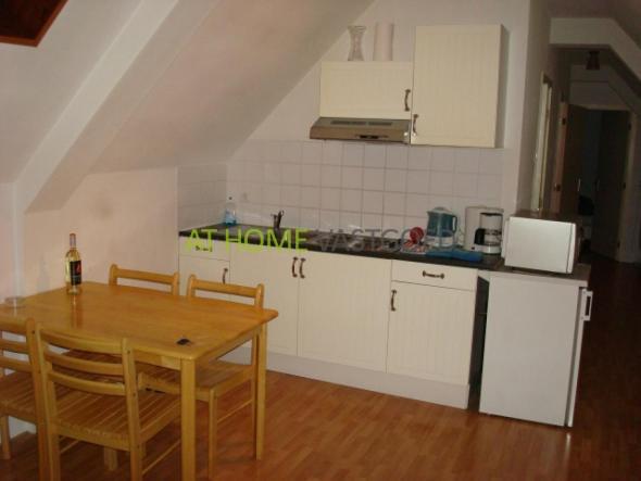 U bereikt het appartement via een ietwat steile trap en stapt zo de woonkamer met zithoek in. Hier is ook het keukenblok (zie kenmerken voor aanwezige voorzieningen) met eettafel voor 4 personen. Dit alles onder het knusse schuine dak.