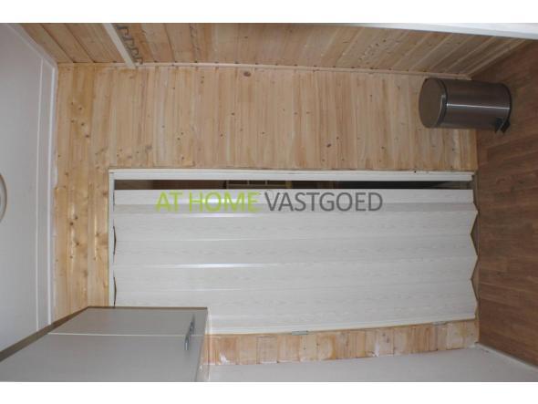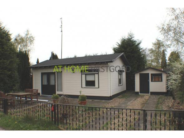 De zonnige tuin heeft een betegeld terras en is rondom het chalet gelegen. Aan de achterkant bevindt zich ook een buitenkraan. Naast het chalet is een ruime oprit waar u uw auto kunt parkeren. Tevens staat hier de de ruime berging met waarin elektriciteit.