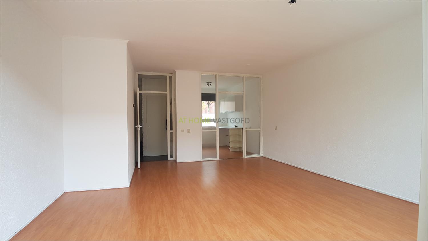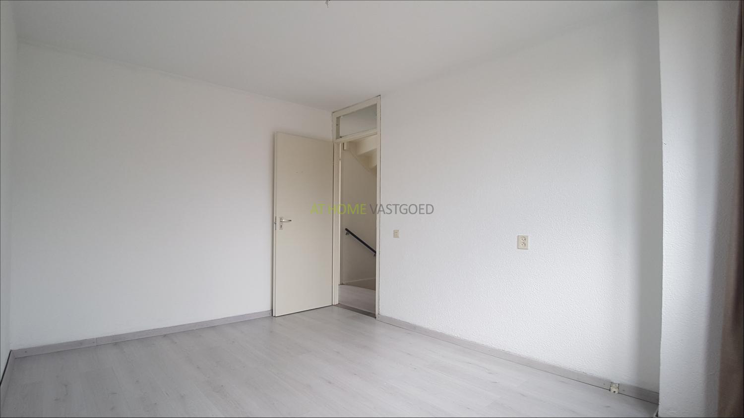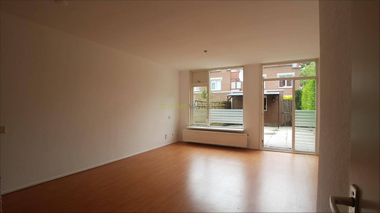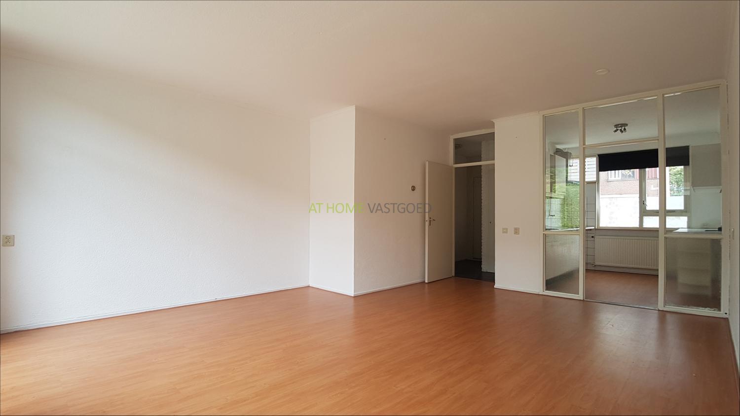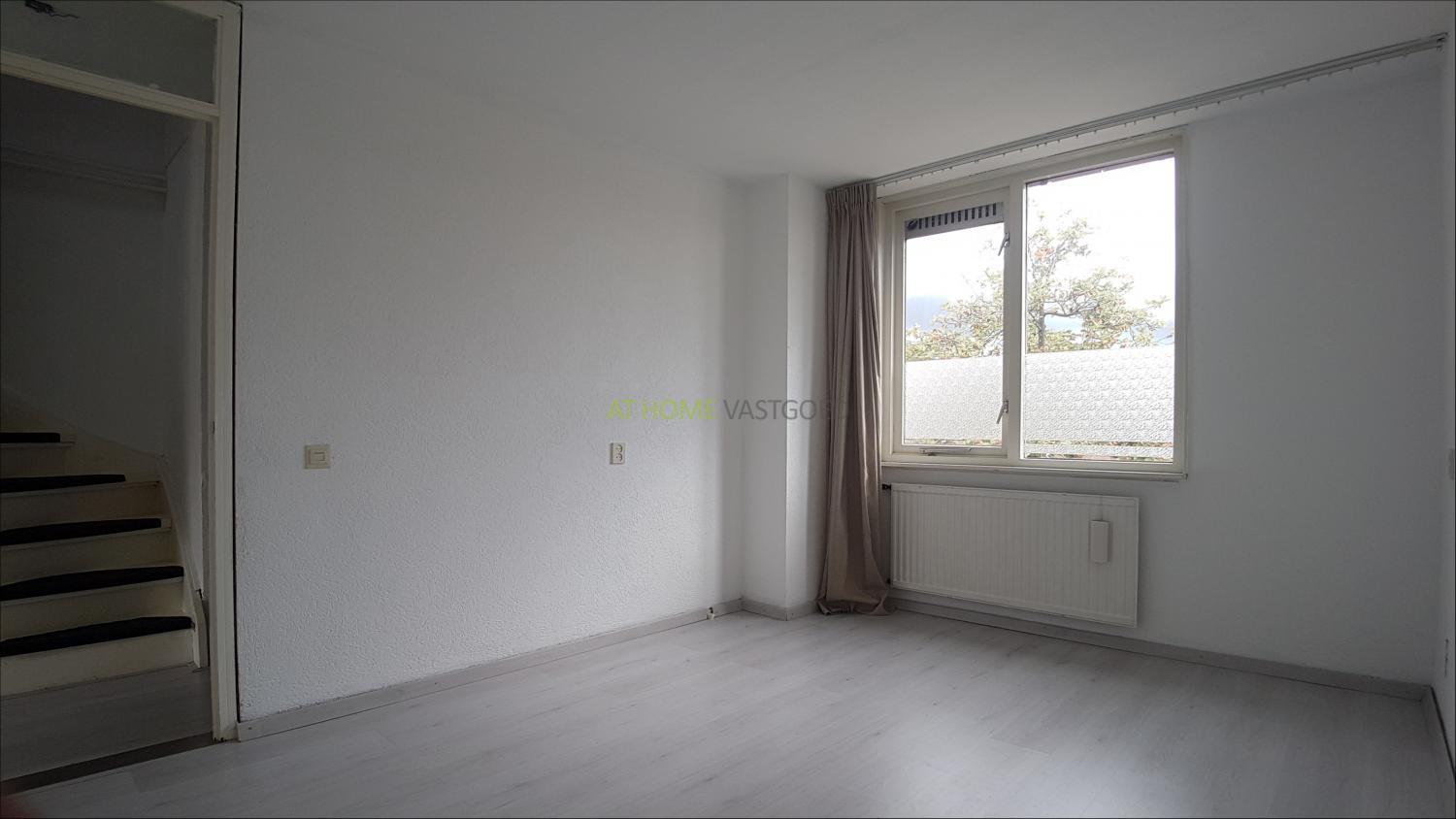 Entree, hal, toilet met fonteintje, trap naar de bovenverdieping en toegang tot de woonkamer. De ruime lichte woonkamer is voorzien van laminaat, en biedt toegang tot de tuin met achterom en stenen berging. Nette eenvoudige keuken welke ook via de woonkamer te bereiken is.