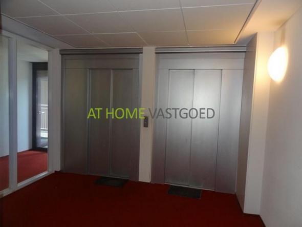 Centrale afgesloten hal met bellentableau, brievenbussen en liftinstallatie.