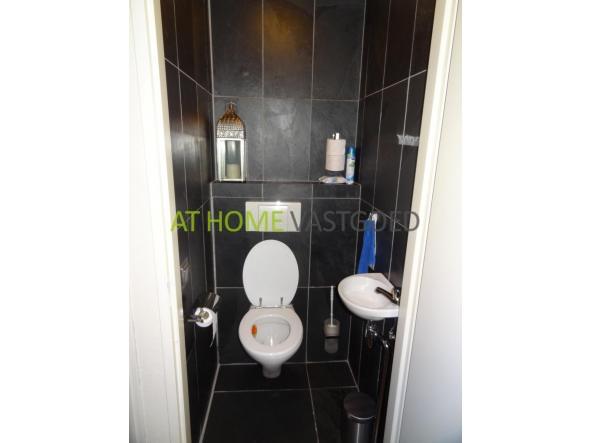 Volledig vernieuwd toilet (2009) met hangend toilet en betegeling in natuursteen.