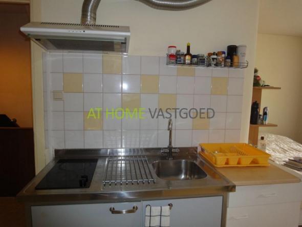 1e etage: overloop, badkamer, toilet, entree ruime studio met eigen keuken, de keuken is voorzien van een elektrische kookplaat, magnetron, afzuigkap en koelkast.