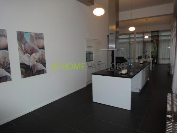 Via de entree met vide en toilet komen we in de riante living en keuken met grote glazen puien van vloer tot plafond. De woonkamer is v.v. een stenen vloer met vloerverwarming. Het gevoel van ruimte wordt nog eens onderstreept door de bovengemiddelde plafondhoogte van maar bijna vier meter. De open woonkeuken is uitgerust met een kookeiland en voorzien van alle denkbare apparatuur zoals vaatwasmachine, koel-vriescombinatie, 6-pits gaskookplaat met afzuiginstallatie en een combimagnetron.