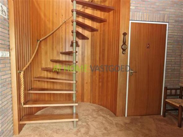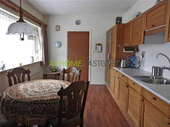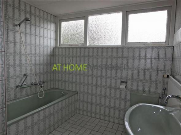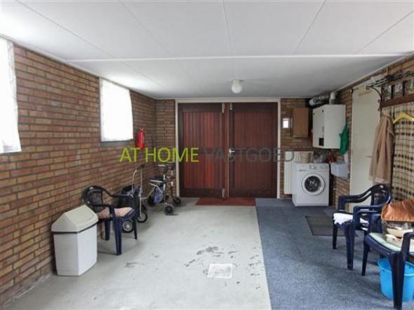 Verdieping: ruime overloop en 2 ruime slaapkamers waarvan 1 met een deur die toegang biedt naar het platte dak van de garage. Vanaf de overloop is de grote badkamer met ligbad en 2e toilet toegankelijk. Achter de knieschotten is veel bergruimte aanwezig.